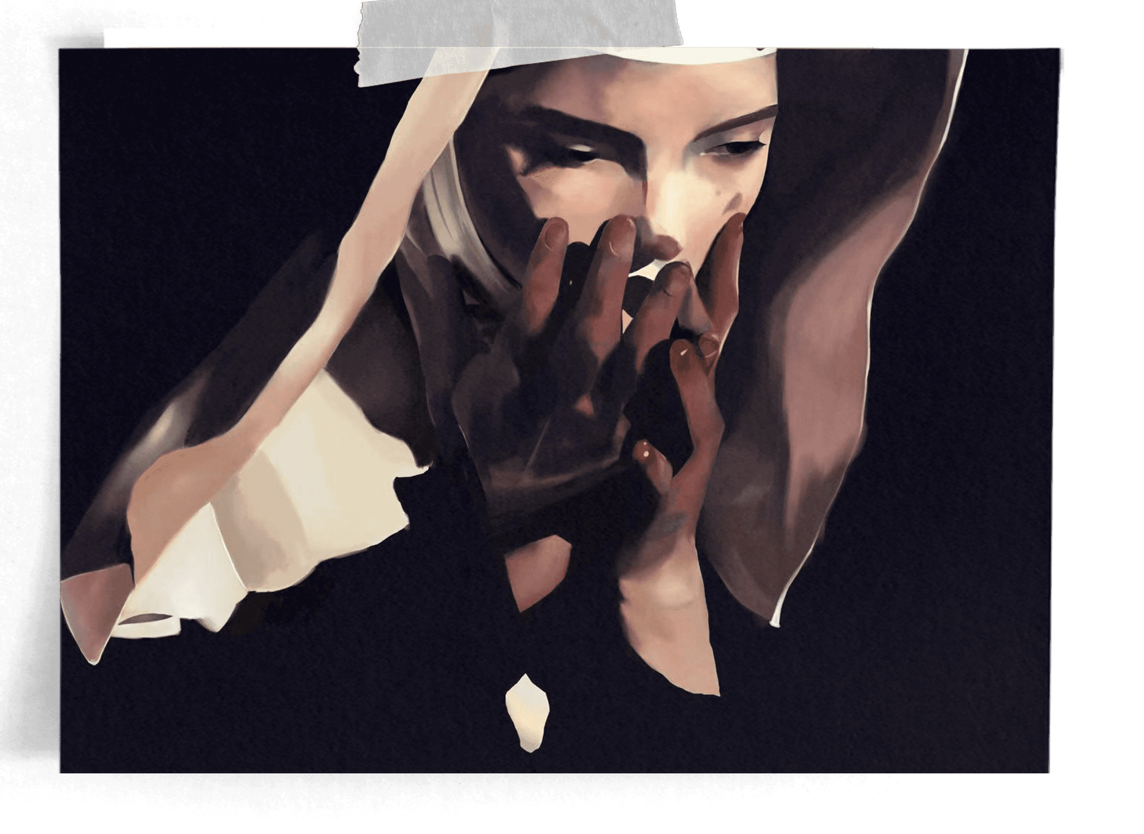 Inspired by a single frame from a film, the work uses shadows in purple and deep blue to amplify the character’s emotion, enhancing contrast and creating a striking visual impact.