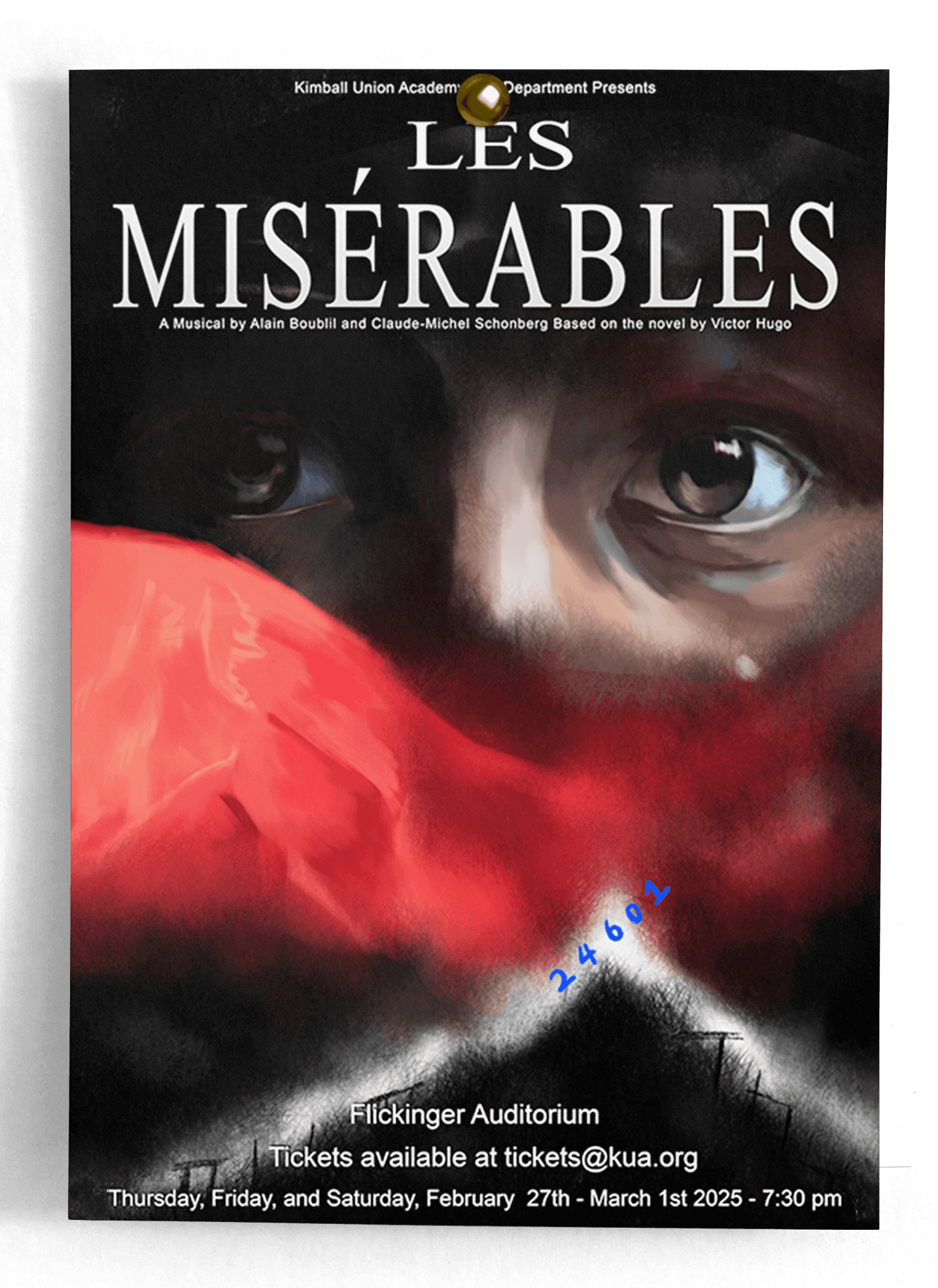 A poster for the school musical Les Misérables. The eyes in the background reflect the red flag, conveying determination and echoing the flag in the foreground. Black smoke blurs the flag’s edges, while black chaos in the front symbolizes revolutionary turmoil. The number “24601,” the protagonist’s prison ID, recurs throughout the performance.