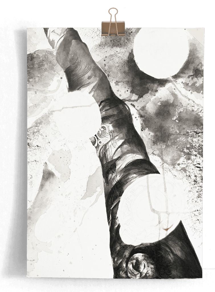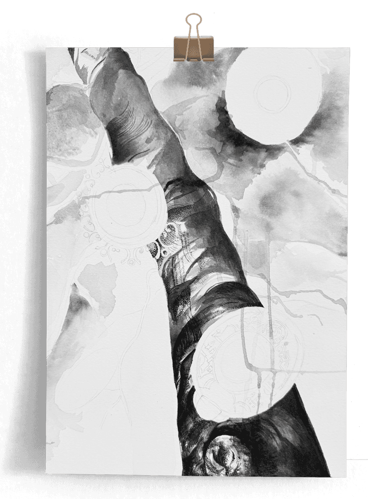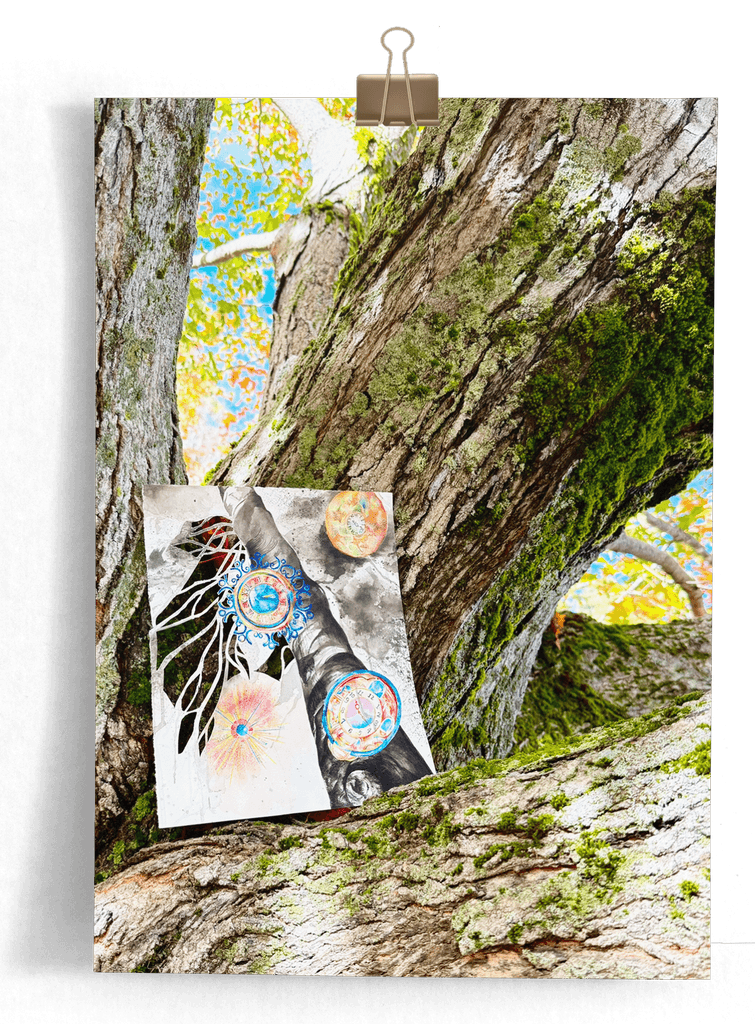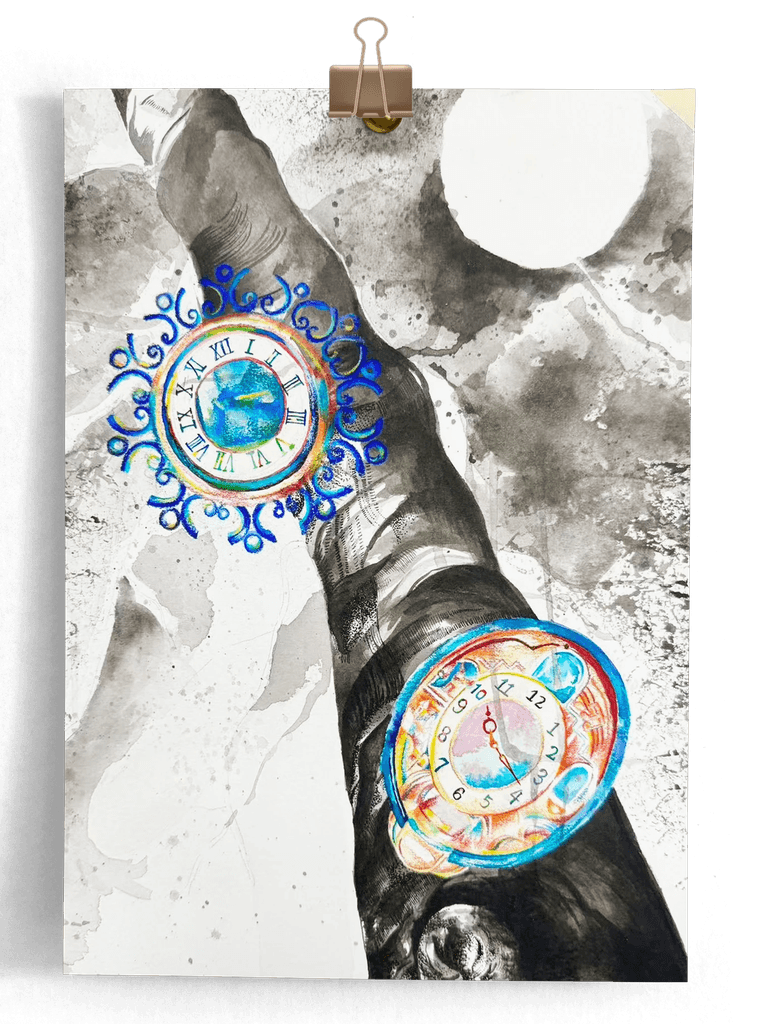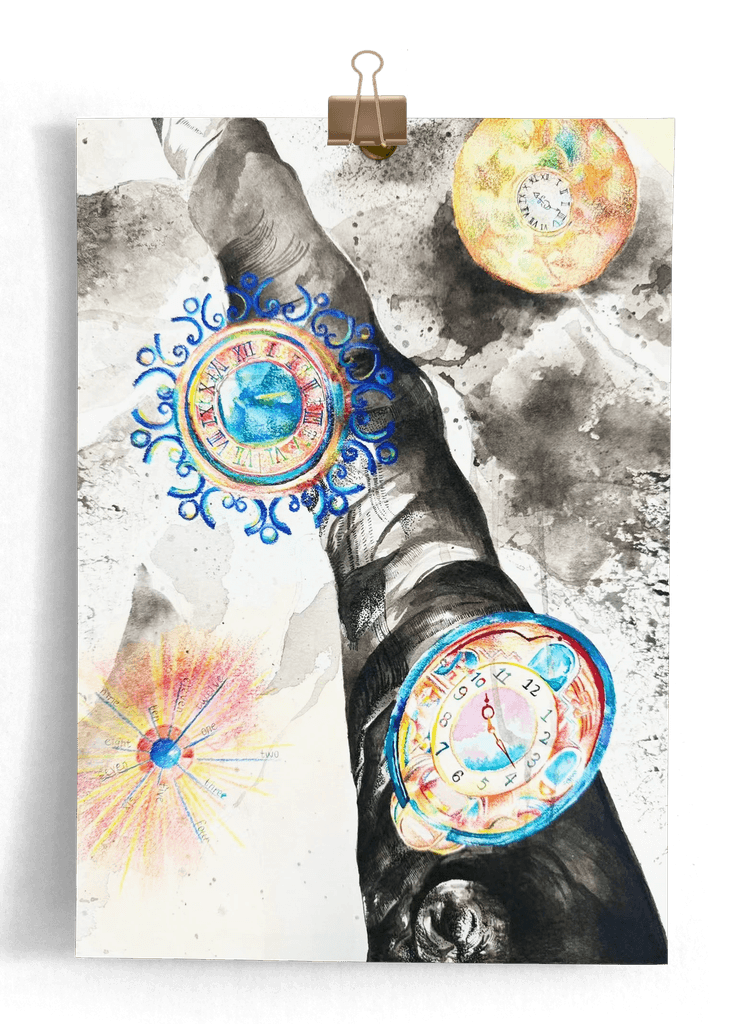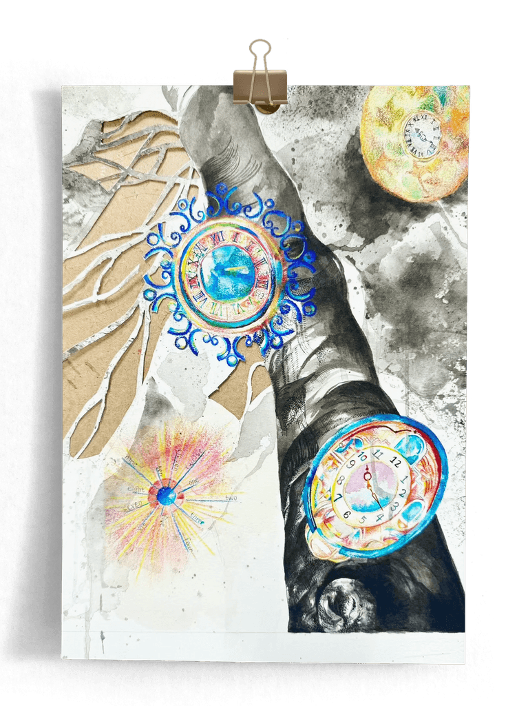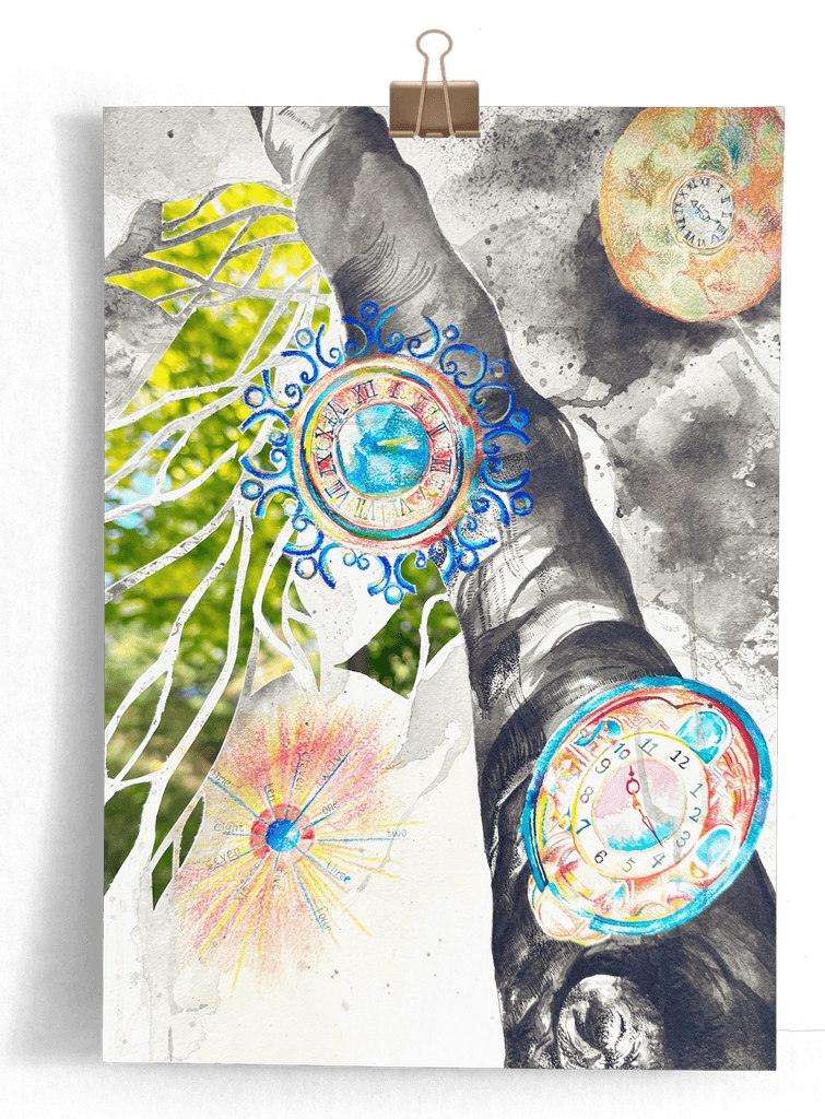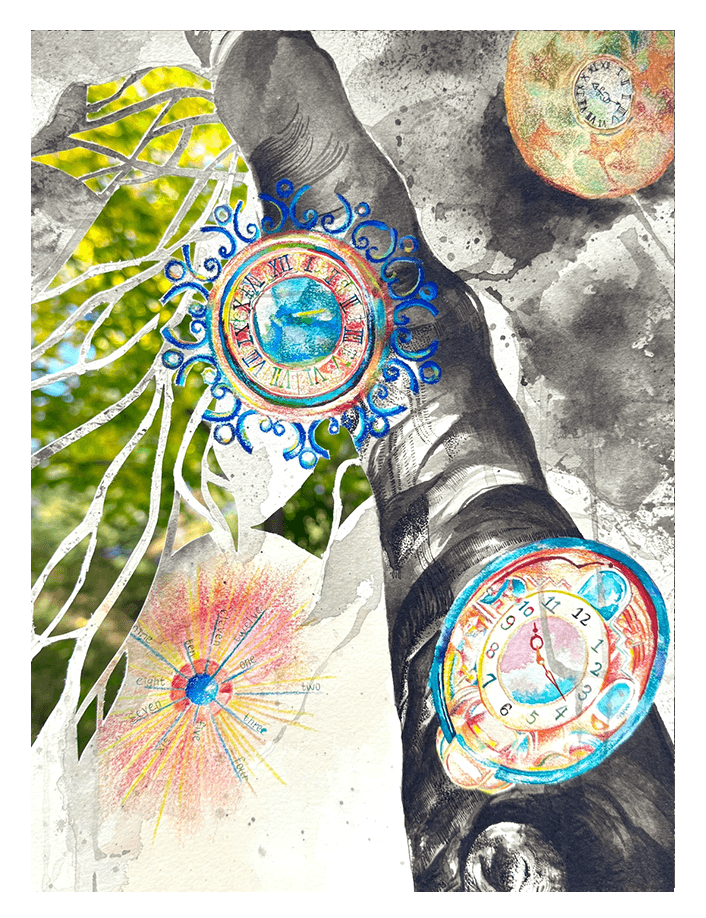 The four clocks in the work represent my family members, each corresponding to their respective eras, with the hour and minute hands pointing to their birthdays. The piece combines ink and colored pencils, contrasting the black-and-white trees with the colorful clocks. Some branches are carefully cut with a craft knife, allowing the artwork to be placed within natural settings, where real leaves become part of the composition. This interaction between the artwork and its environment extends the space and meaning, exploring family connections, the passage of time, and the integration of life with nature.