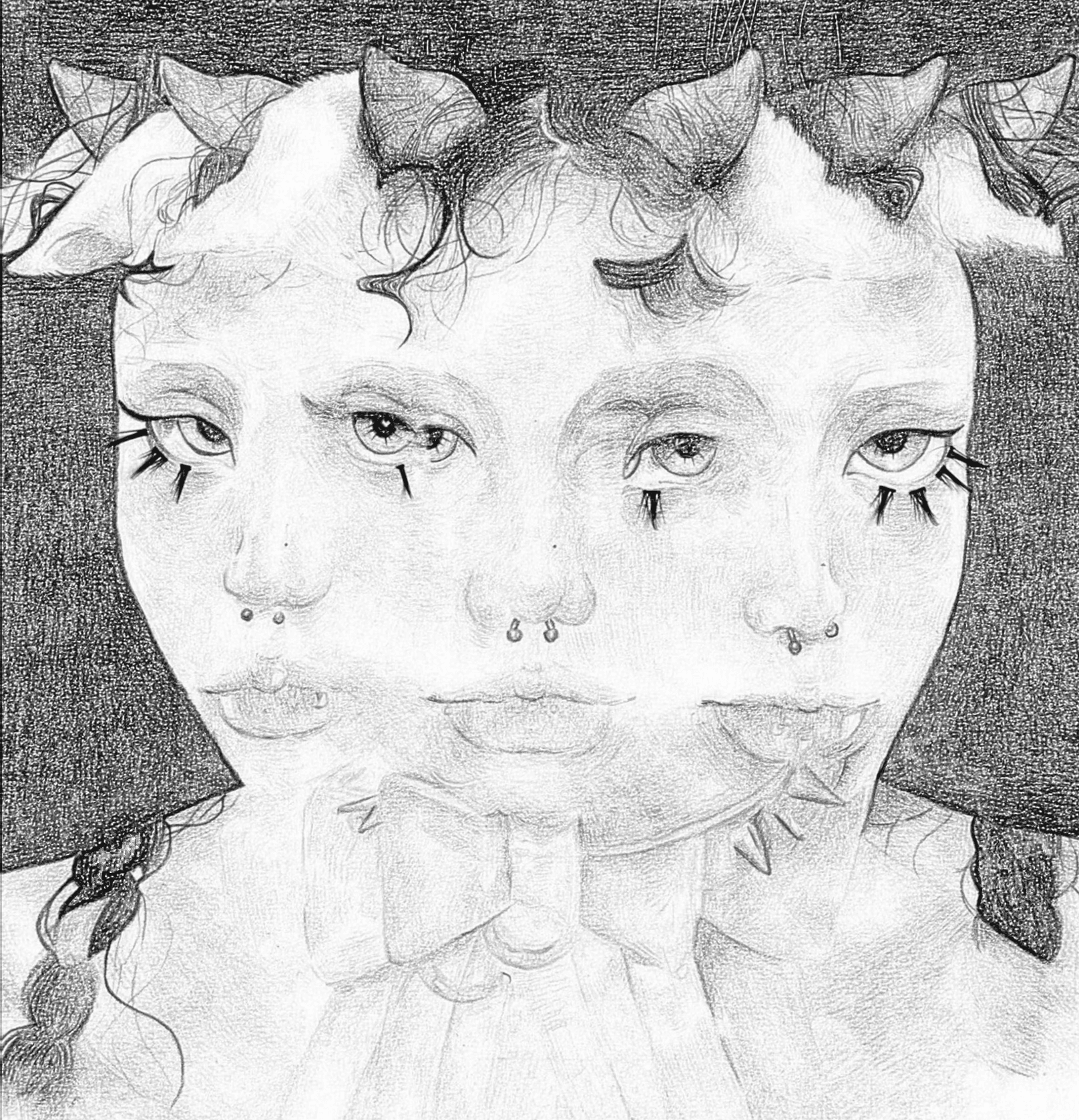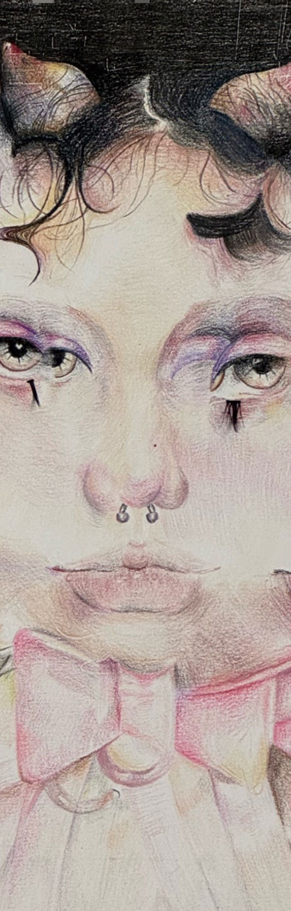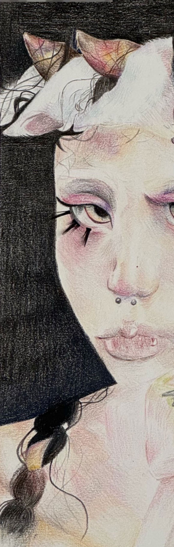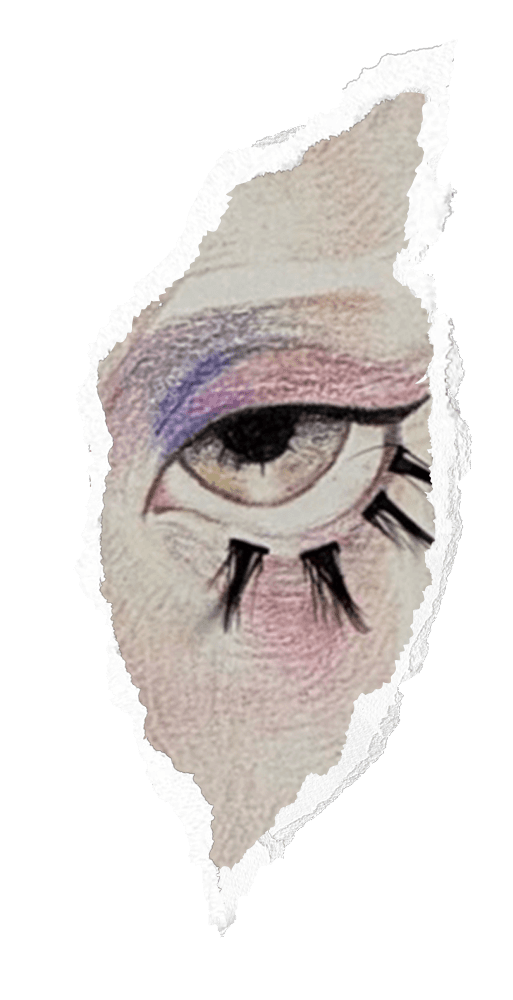 This work is inspired by a photograph and explores the layering of time using colored pencils and false eyelashes, creating a sense of emptiness and reflection.